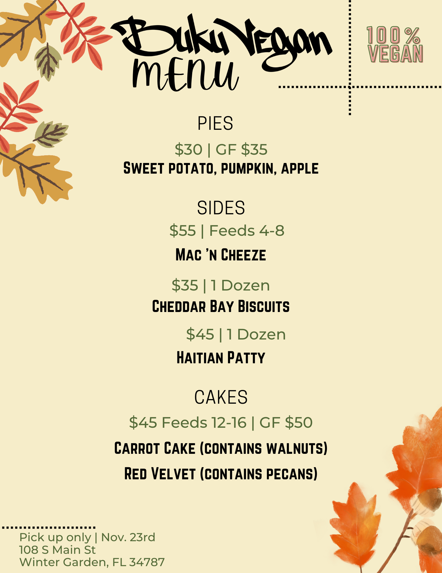 Here is Buku Vegan’s Thanksgiving 100% vegan menu! Feel free to contact Chef Chicoye directly at jennychicoye@gmail.com for any questions or to place your order. Check out Buku Vegan’s website right here: www.facebook.com/bukuvegan