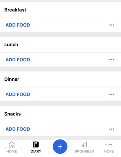 After clicking on the “Diary” tab at the bottom, you will see this screen with the different meals you can add throughout your day.
